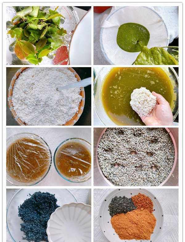 烏飯葉汁水呈現黃綠色,黃綠色的水打好之後放在紗佈中過濾一下,把烏飯葉的渣過濾出來,把汁水擠出來,擠好的烏飯葉渣渣丟掉不要,就留下烏飯葉汁水,這裡建議戴上手套操作,否則手上也會被染上顏色;