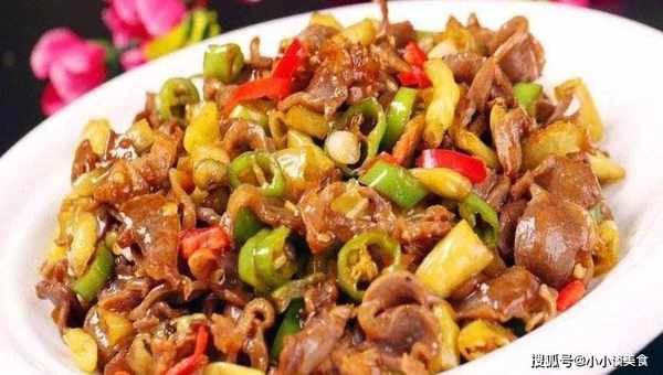 平底不粘鍋倒入所需量的油,將切好的薑蒜片放入其中炒熟,依次放入雞肉、心、肝,最後炒雞腸。
