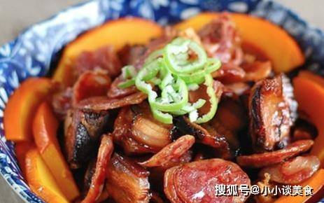 原料:香腸、培根、培根片、南瓜、薑片、料酒、鹽、糖