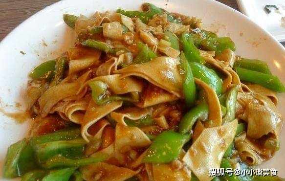 3、青椒炒熟後放入豆腐皮中,加少許鹽炒熟。