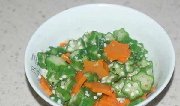4、最後把秋葵和胡蘿卜加蒜末和所有調料拌勻就可以品嘗啦,十分鐘搞定,很方便。