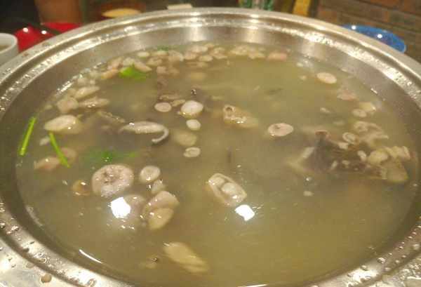 內蒙古的羊雜湯與其他地方有著明顯的區別。首先是選材。大概是價格差距吧,其他地方的羊雜湯多是心肝肺,腸,肚相對少。在內蒙古,若是采取這種做法,會被人傢當成偷工減料,要關門大吉的。朋友點的羊雜湯,湯色清澈,上面漂浮著切好的腸斷,底部則是羊肚和碎肉。趁著熱氣騰騰,盛入碗裡,放入胡椒粉。輕輕的呷一口,甜咸適中,辣味鮮爽,實在快意人生。