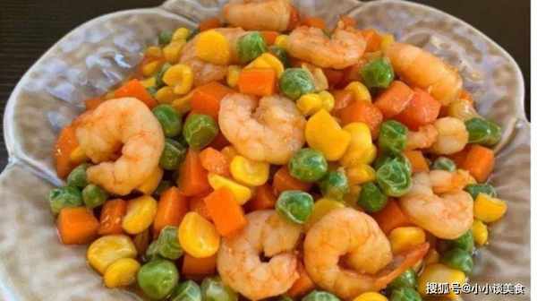 2.胡蘿卜、玉米、豌豆焯水備用!3.鍋裡放少許油,爆香洋蔥和薑,然後加入蝦炒變色,然後加入胡蘿卜,玉米和豌豆翻炒1分鐘,然後加入1湯匙生抽,1湯匙蠔油,少許鹽炒香-約煮一分鐘左右。