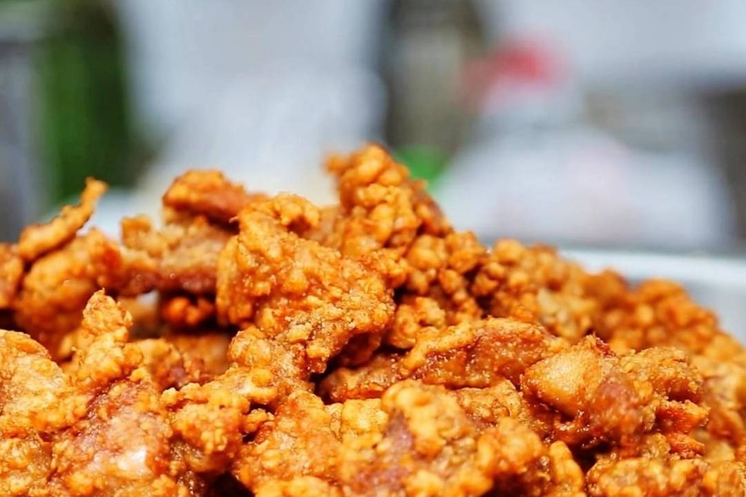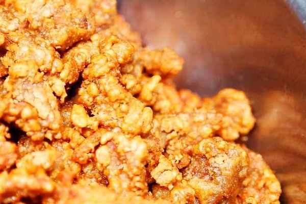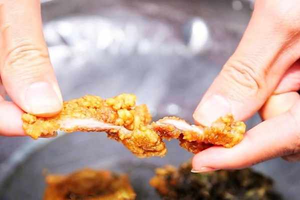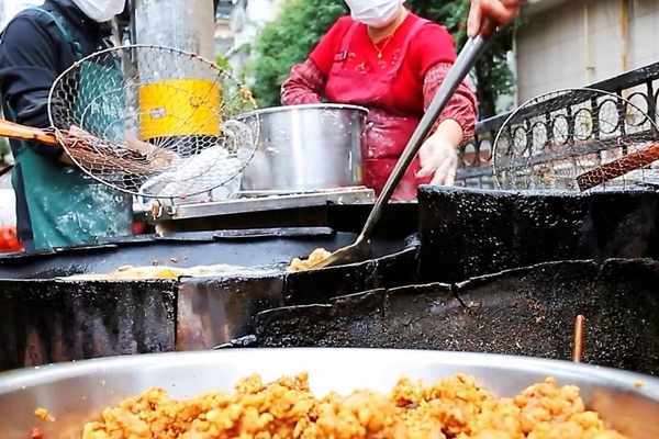 油溫升高後,將肉條下鍋,肉條入鍋後油鍋瞬間沸騰出氣泡,炸至金黃酥脆後撈出,可以聽到炸好的食材與容器碰撞發出清脆的響聲。剛出鍋的時候吃口感是最好的瞭,很多人交完錢拿到手之後直接就開吃。隨著醋肉的味道在口腔蕩漾開來,嘴角也不自覺地泛起一絲滿足的笑意。
