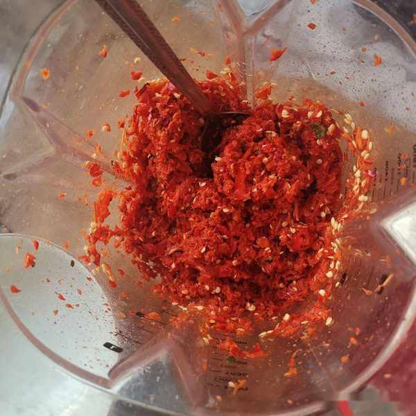 第二步:把新鮮紅辣椒放到破壁機中,攪打成顆粒狀。