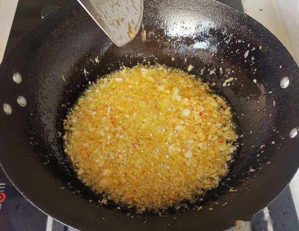 第四步:鍋裏放入花生油,放入花椒和八角炒香,撈出花椒和八角,再倒入蒜末小火炒出香味。