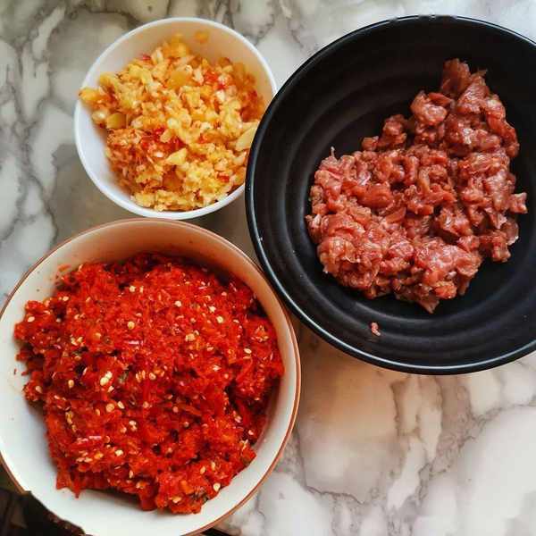 第一步:新鮮紅辣椒摘去蒂洗淨備用。天氣潮濕或者天寒地凍,適當吃些辣椒,對預防風濕病和凍傷有好處。辣椒能新增消化液分泌,有一定的助消化作用,還可以减脂瘦身,是很不錯的調味品。今天我們把它做成牛肉辣醬,比買得好吃多了。