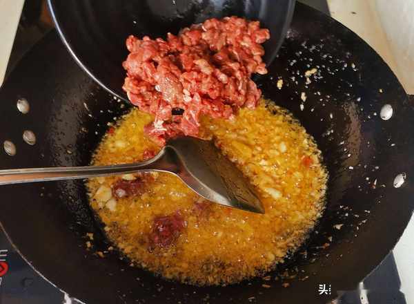 第六步:把牛肉煸炒至發幹的狀態,倒入豆瓣醬煸炒。