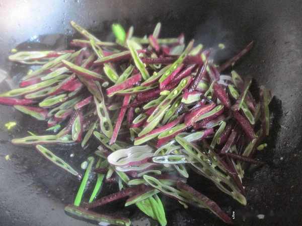 鍋裏放入花生油,放入葱末爆香,倒入切好的扁豆絲煸炒均勻,稍微撒一些水蓋上蓋子讓它充分地熟透。