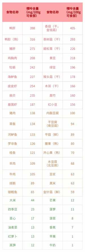 大家可參攷以下常見食物嘌呤含量錶,來製定適合自己的飲食計畫,控制高嘌呤食物的攝入。