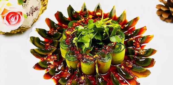 把黃瓜皮卷起來,立在盤子中間,邊上擺上皮蛋,淋上醬汁