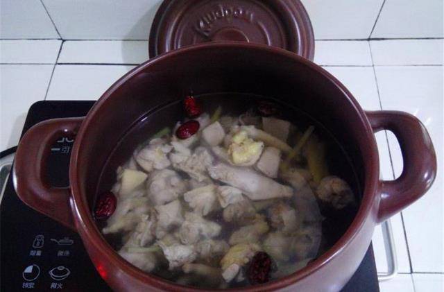 第三步:煲雞湯。準備一個砂鍋,將紅棗去核切片放入鍋中,加入一些生薑片,把剛剛焯水的雞肉放入鍋中,多加一些溫水在鍋中,大火煮十分鐘左右後,揭開鍋蓋將湯面上的浮沫舀出去,用湯匙稍微將雞肉和榴蓮瓤攪動一下,然後改成小火煲湯四十到五十分鐘,我們就可以看到我們煲出來的雞湯湯面上會浮出一層金黃色的油,聞起來就超香。