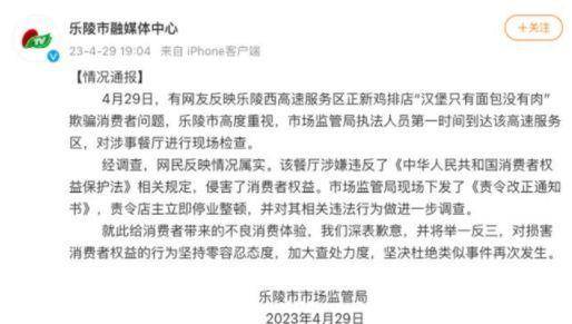 經過調查,樂陵市市場監管局確認該店鋪售賣次品行為為事實,並對餐廳進行瞭責令整改通知。責令停業整頓期間,該店鋪將無法為顧客提供任何餐飲服務。