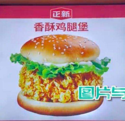 店內宣傳廣告圖顯示,香酥雞腿堡除瞭兩片面包外,中間夾有蔬菜和雞肉,與顧客購買到手的漢堡相差甚遠。