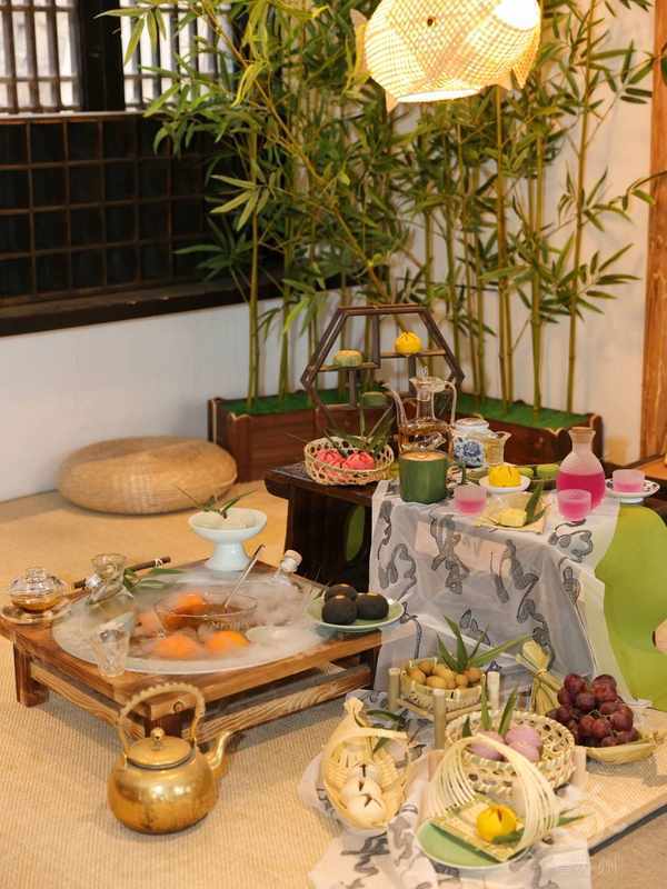 記者環顧四周註意到,精巧的榻榻米上,放置著竹制的小圓桌、透明的玻璃容器、形狀各異的果籃和點心架,再配以花花草草、小溪流水,用瞭類似於竹簾和紗幕的佈料加以裝飾,微風拂過,仙氣飄飄。