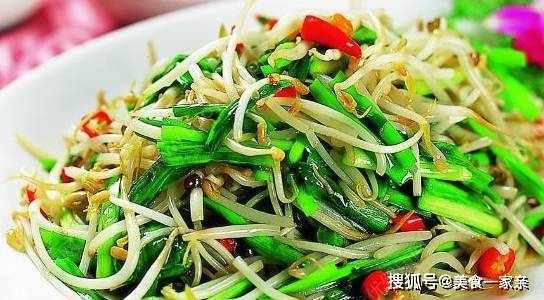 做法三:原料:綠豆芽400克,韭菜100克,植物油50克,精鹽6克,蔥薑各少許。