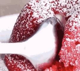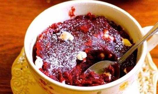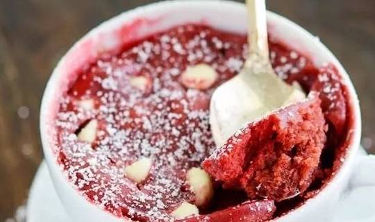 不需要烤箱,也不用打發任何食材,隻要簡單地攪一攪,微波爐“叮”1分鐘左右,質感十足的紅絲絨蛋糕,完成!