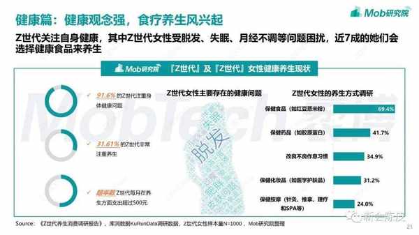 健康養生不再是老年人的專屬,新青年正以自己的方式掀起健康養生新風潮。據Mob研究院《2022年Z世代女性洞察報告》顯示, 高達91.6%的Z世代註重身體健康問題,超過31.61%非常註重養生,超半數的人每月在養生方面支出超過500元。
