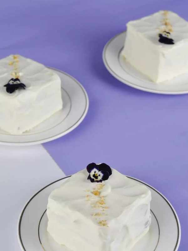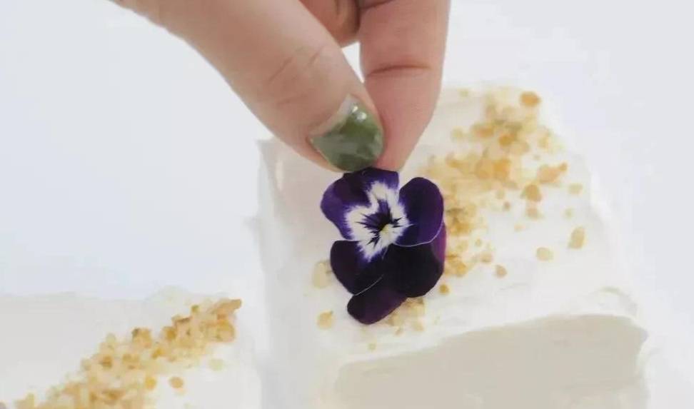 4、每個蛋糕上可以撒一圈堅果碎,放上鮮花裝飾,芋泥蛋糕就完成啦。