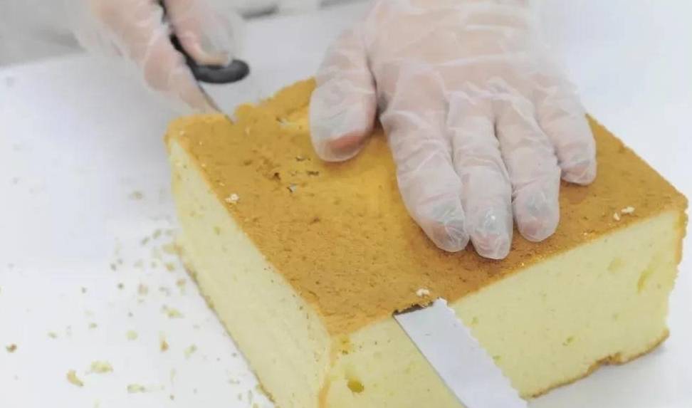 1、蛋糕胚切去多餘的部分,再切分成三層。
