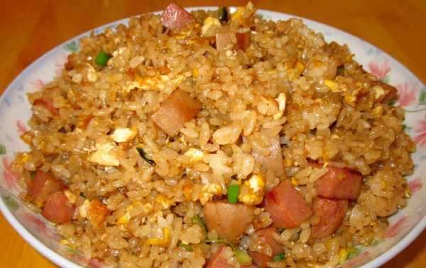 火腿炒飯:先將雞蛋炒散,然後放入蔥花、火腿丁和少許鹽繼續翻炒;倒入適量的米飯,再倒入少許白酒,翻炒均勻後加入花椒面,倒入醬油,炒散、炒勻就OK啦!白酒的作用是讓米飯迅速散開,一粒是一粒的,效果非常好,你也來試試。