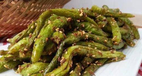 材料:扁豆角400g,油適量,鹽適量,薑適量,蔥適量,五香粉適量,孜然適量,熟芝麻適量,雞精適量,醬油適量