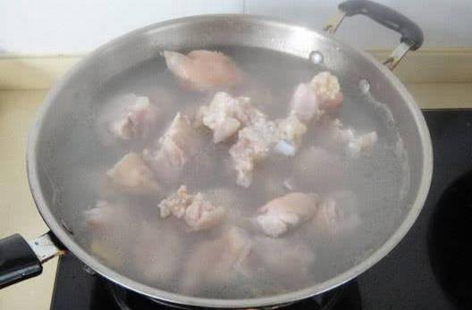 接下來把豬蹄冷水下鍋炒一遍水,再加入適量的料酒去腥,給豬蹄焯水的時候一定要冷水下鍋,這樣才能把豬蹄裡面的血水給煮出來。水煮開以後再把豬蹄上面的浮沫給撇幹凈,撇幹凈以後再開中火煮五分鐘,將豬蹄煮透。
