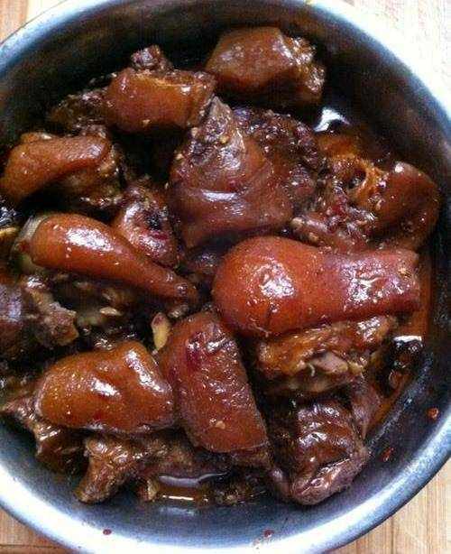 時間到瞭以後打開蓋子將它端出來,然後再倒進炒菜鍋裡面,來收一下湯汁,再用筷子將裡面的調料全部挑出來,這樣做好以後才不會影響美觀,全部挑幹凈以後再開大火收汁,等湯汁收好以後這個豬蹄的顏色就會非常的紅亮,把湯汁收至粘稠的時候就可以出鍋瞭。