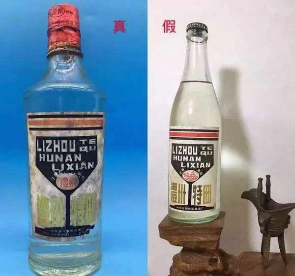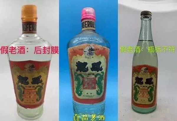 比如真老酒和臆造老酒的對比,真老酒的瓶蓋封膜、酒標和瓶型都是相互對應和自然包漿的。