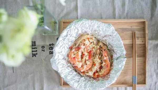 5、然後依次鋪上醃制好的蝦、噴香的蒜蓉,錫紙包好,入烤箱烤20分鐘,烤箱溫度設置在180°。