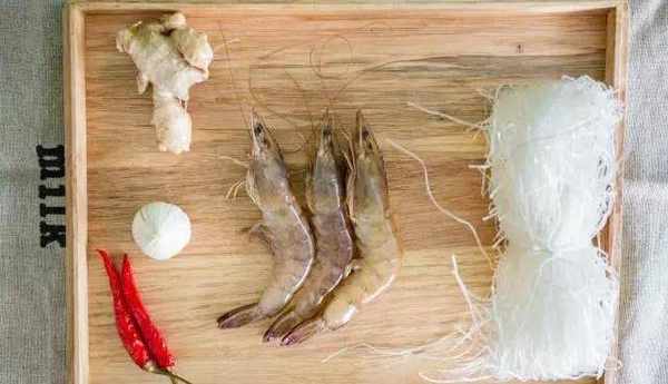 食材:鮮蝦、龍口粉絲、大蒜、生薑、辣椒、蔥、白酒、醬油、糖