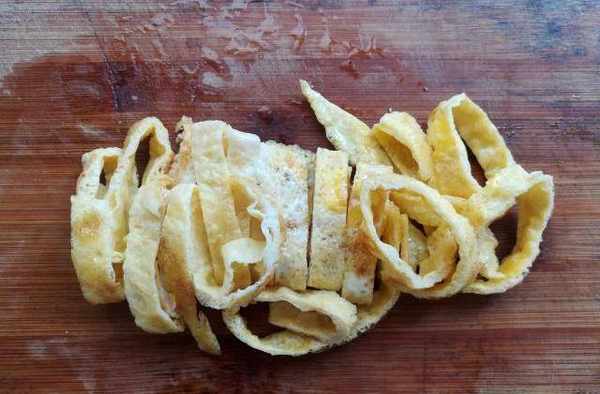 3.雞蛋去殼加適量的鹽攪打一會,放入鍋裡煎成蛋餅,盛出後卷起來切成細長條。雞蛋是用來裝飾的,用一個就夠瞭。