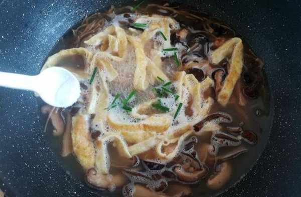 9.出鍋前加入鹽調味,加適量的蔥花增加香氣,不建議加香菜,味道太濃鬱,會蓋過菌菇湯的鮮味。