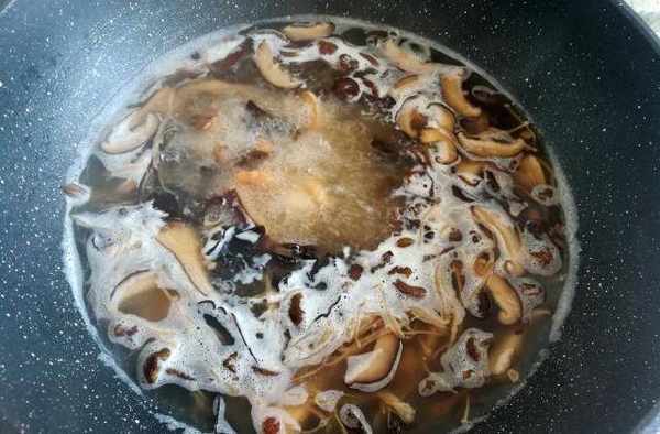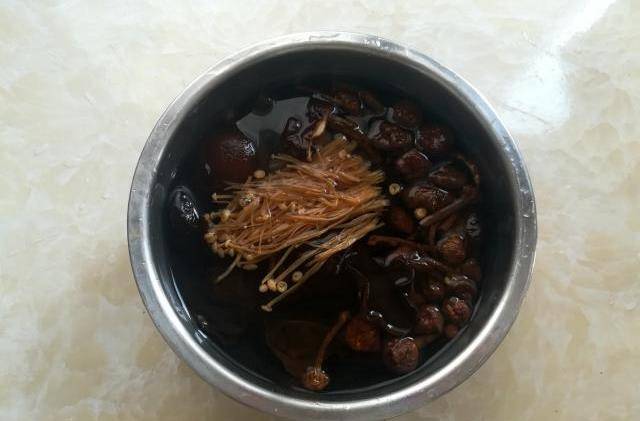 1.滑子菇、木耳、香菇和金針菇用水泡發,菌菇湯裡的幹菌菇可以隨意搭配,建議多用金針菇,它含有大量的氨基酸,尤其是耐氨酸要比其他菌菇高很多。菌菇的泡發率很高,每次泡一點點就可以瞭,不要泡太多。