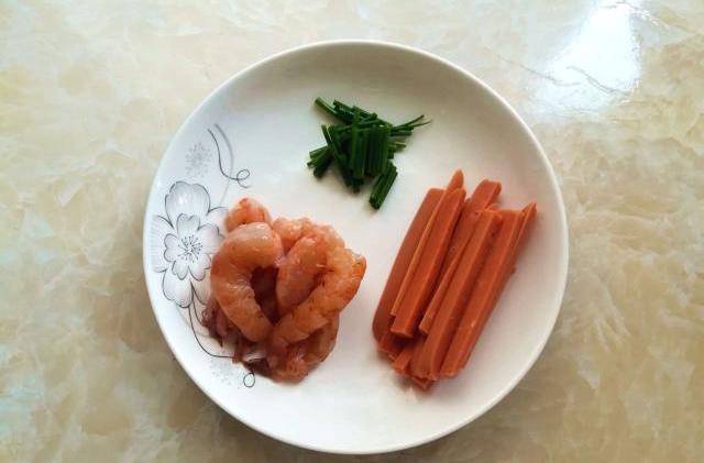 2.蝦仁解凍去掉蝦線,香腸切成小拇指長的細長條,蔥花洗凈切成小段,能買到活蝦的話,最好用活蝦,不喜歡香腸的可以不放。