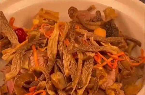 炒好後控幹水分,倒在一個砂鍋中,再準備一袋松茸菌湯包,倒上溫水浸泡十分鐘。