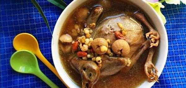 材料:白鴿1隻,瘦肉50克,薏米50克,紅棗枸杞適量,薑片10克,鹽調味。