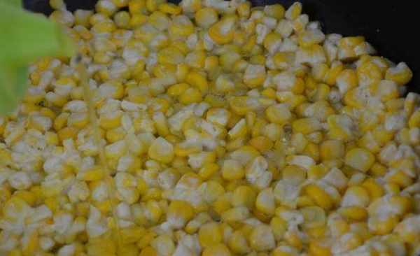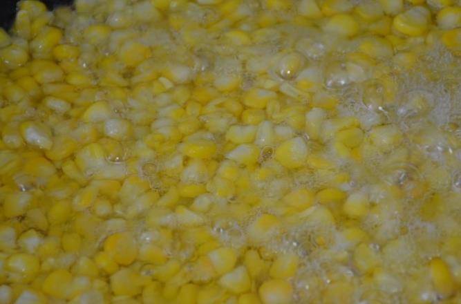 等到玉米完全的裹上淀粉以後,就可以起鍋熱油瞭,準備一口平底鍋在鍋底加入一些油,等到油燒熱以後我們把油倒出來一些,在鍋底留有少許的底油,然後把玉米粒倒入鍋中。