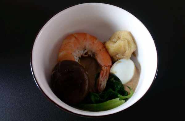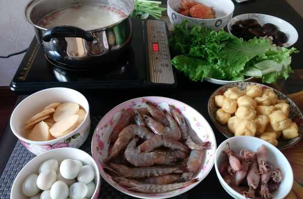 傢樂豬骨濃湯寶適量,枸杞適量,生菜適量,香菜少許,茼蒿適量,香菇適量,金針菇適量,木耳少許,蟹足棒少許,辣椒油少許,白玉菇適量,魚丸少許,海蝦適量,河蟹3隻,紅薯片適量,墨鬥魚少許,蠔油適量,豆腐泡適量,粉絲一小把,切面250克,芝士1片,熟鵪鶉蛋適量,蔥薑適量,麻將適量,香油少許