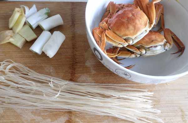 紅薯剝去外皮,切成薄薄的片狀,然後大蔥切段,生薑去皮切片,放置在案板上面以待使用,接著把蒸鍋拿出來,河蟹沖水之後放進蒸鍋裡面蒸熟,最後再把粉絲淋水洗凈。