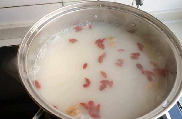 小鍋裡面加入六碗清水,碗的大小是傢裡飯碗那麼大就行,然後把切好的蔥薑放進鍋裡面,接著開火煮開,隨即把兩塊傢樂豬骨濃湯寶和一片芝士放入鍋內,攪拌均勻繼續煮開,這樣火鍋的湯底就制作完成瞭,最後把它倒進火鍋裡面,再加上幾粒枸杞即可。