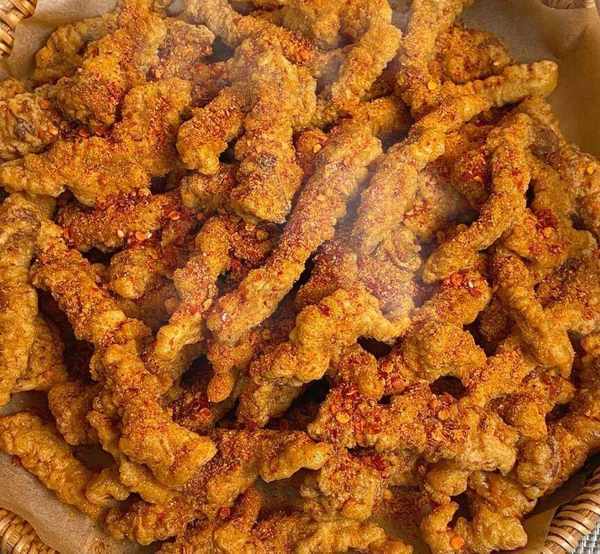4、油溫七成的時候筷子插進去會冒泡,我們下鍋炸酥肉,中火慢炸,炸至金黃撈出。然後復炸,大火復炸十秒。出鍋後撒上辣椒面,孜然粉,椒鹽,或者直接撒超市買好的燒烤料,倍兒香。