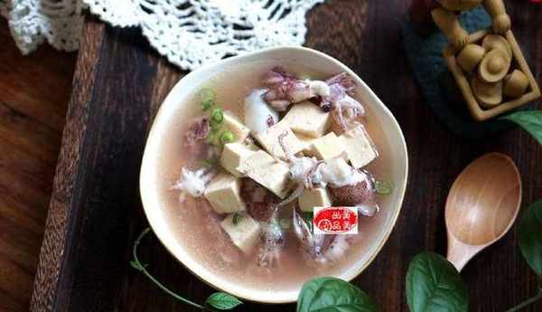【做法步驟】鍋裡加入少許的底油,放入蔥薑爆香,加入適量的清水,放入豆腐丁燉煮,開鍋後放入筆管魚,煮30秒,加鹽即可出鍋享用。
