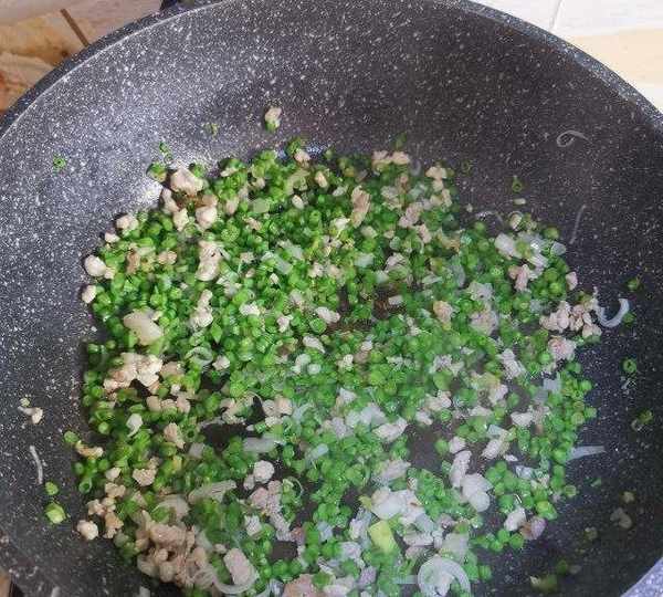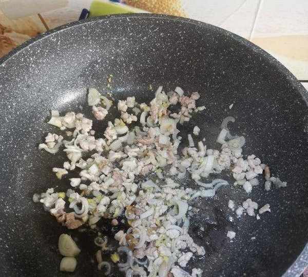 第5步、鍋中油熱下肉末煸炒,肉末變白加入蔥煸炒出香味。
