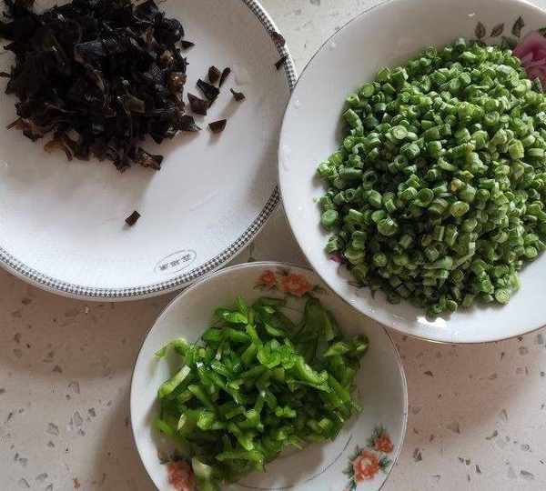 第3步、豇豆、木耳、青椒切末備用。