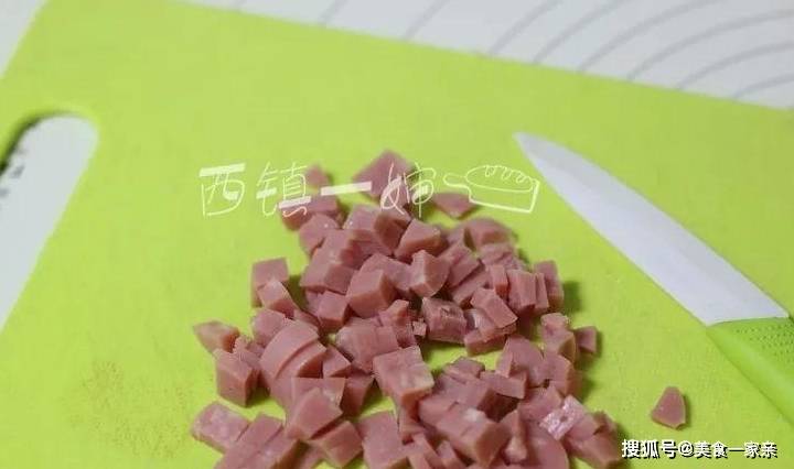 1、先來處理食材,將火腿腸切成小丁狀。