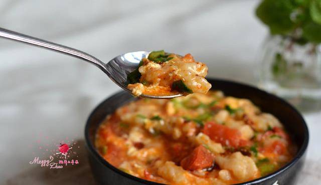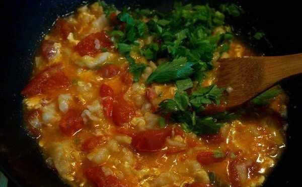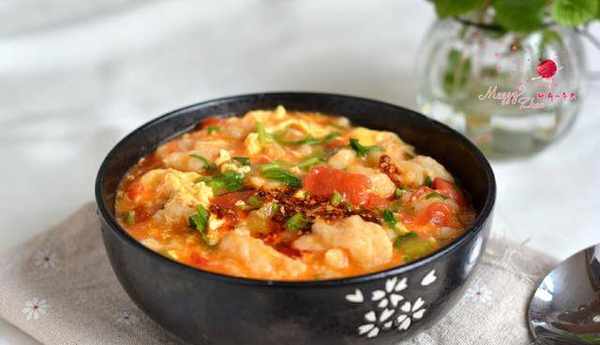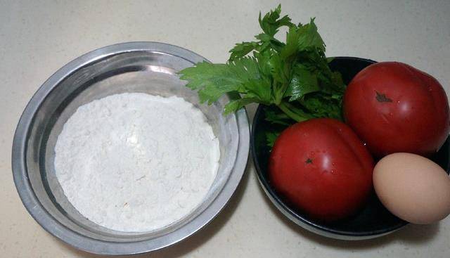材料:面粉200克,清水適量,西紅柿兩個,雞蛋一個,芹菜葉一把,植物油少許,鹽少許,蔥花少許