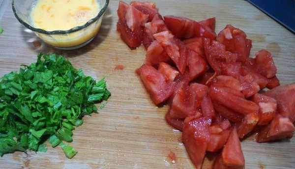 3.將西紅柿切塊,去不去皮隨意,芹菜葉切幾刀,雞蛋打入碗中;