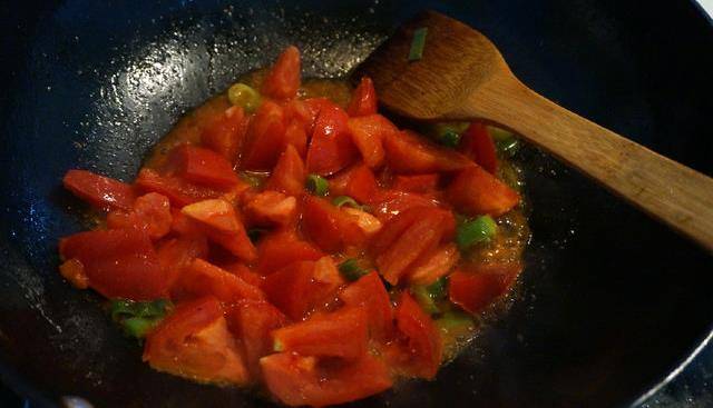 4.炒鍋中倒少許油,入蔥花煸炒出香味,倒入西紅柿翻炒出湯;