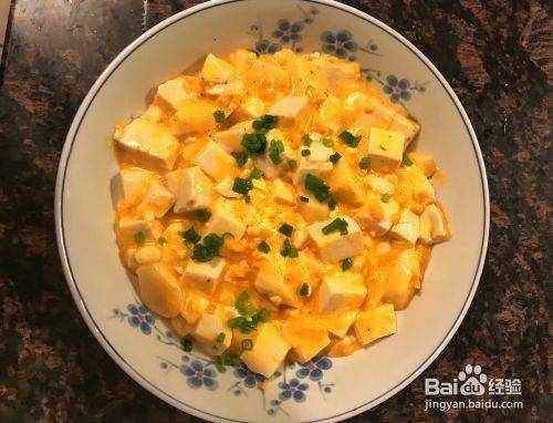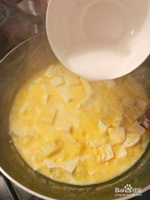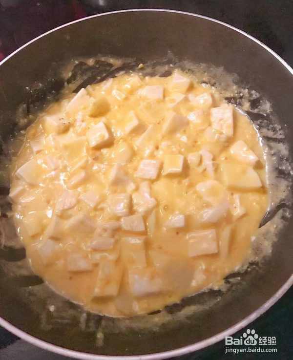 9煎炸一段時間後,蛋黃變得細嫩而有氣泡。如果沒有明顯的大蛋黃,你可以放豆腐